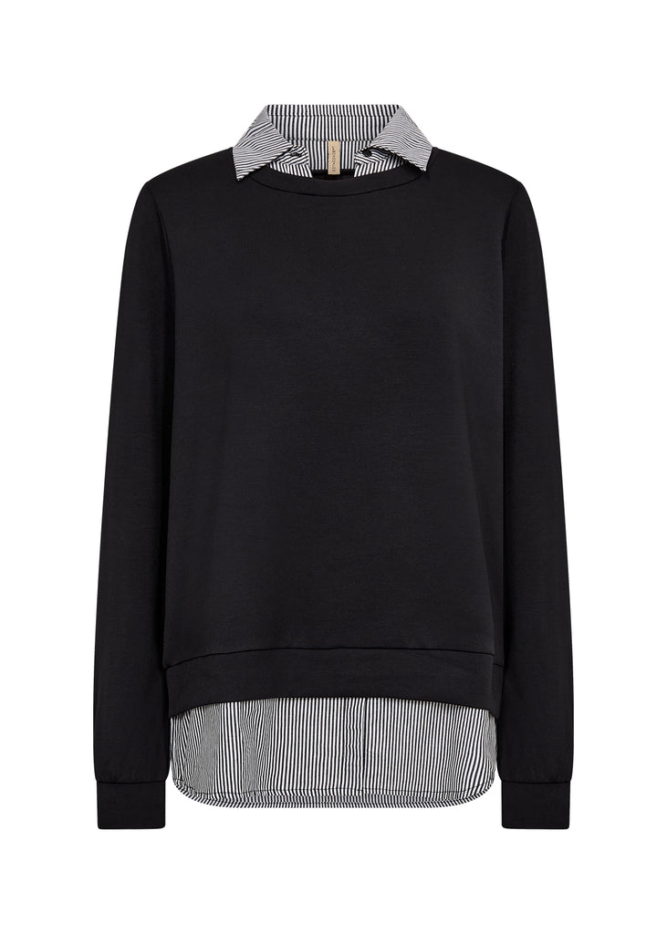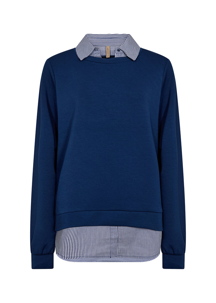 Blusen med "snyde" skjorte under i form af stribet krave og kant, lange ærmer og en rund halsudskæring. Den passer godt sammen med både afslappede jeans og skræddersyede bukser for et smart look.