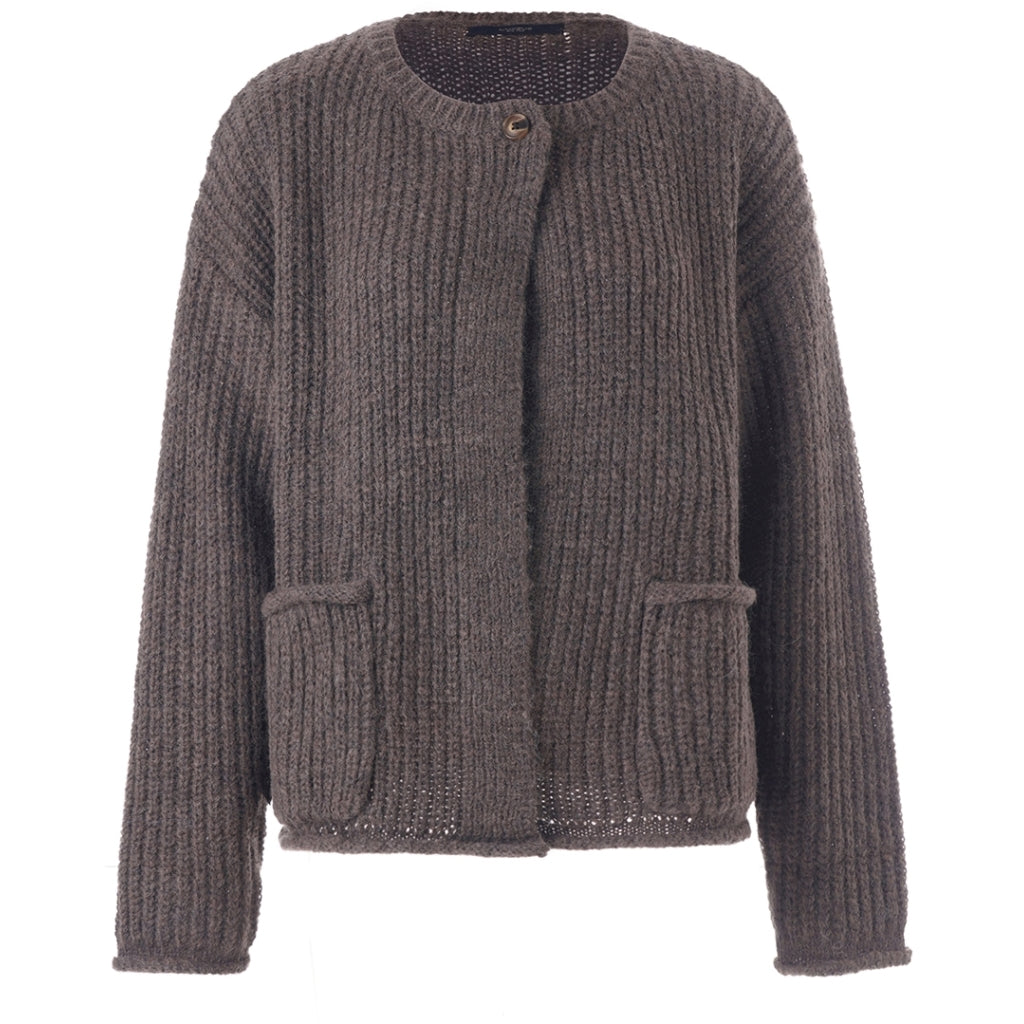 Cardiganen har ribstrik ved kraven, en enkel knap foran og lommer på begge sider af forstykket, hvilket gør den både funktionel og smart.