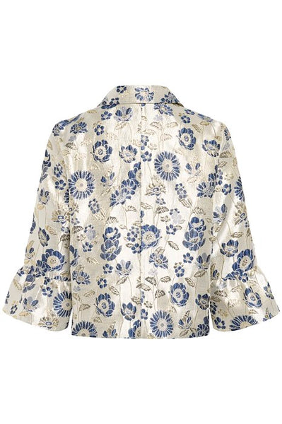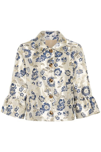 Fin kort jakke med blomster broderi. Den er med krave, gennemgående knaplukning og lommer.