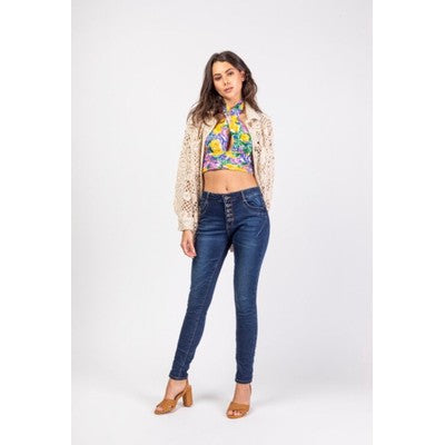 Cool jeans med en masse strech. Den har lommer foran og bagpå, bæltestropper og lukkes med synlige knapper.