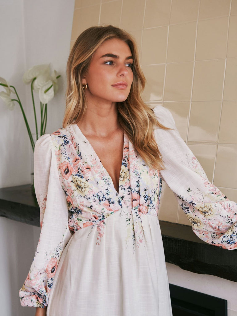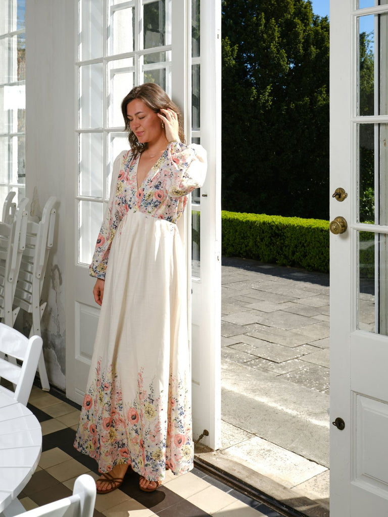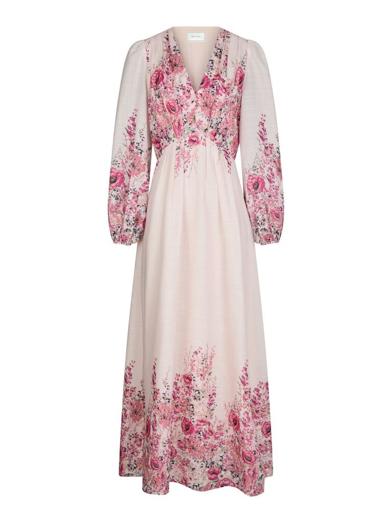Maxi-længde kjole i et smukt blomsterprint. Kjolen har en afslappet, men feminin pasform. Ærmerne er lange og afsluttet med elastik. Modellen er 176 cm høj og bærer størrelse 36.