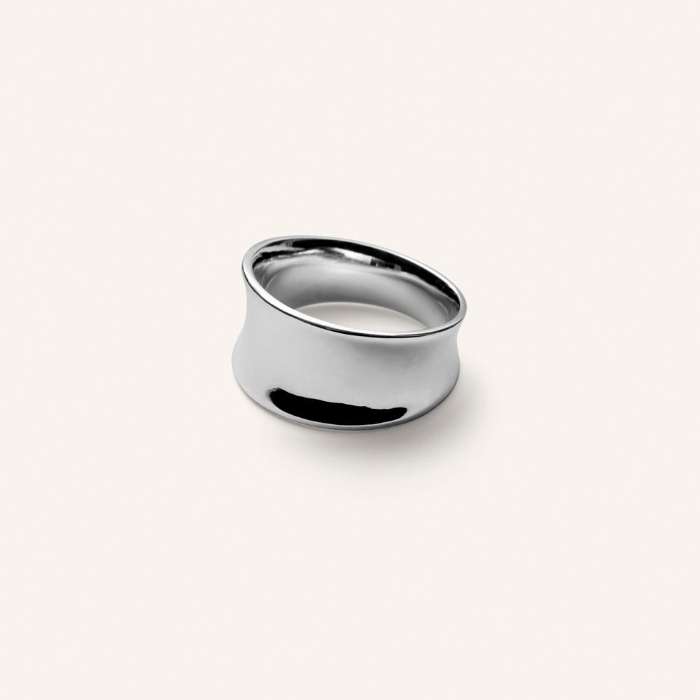 Ringens smukke buede form og den spejlblanke overflade gør, at lyset fanges og reflekteres særligt smukt i denne ring.