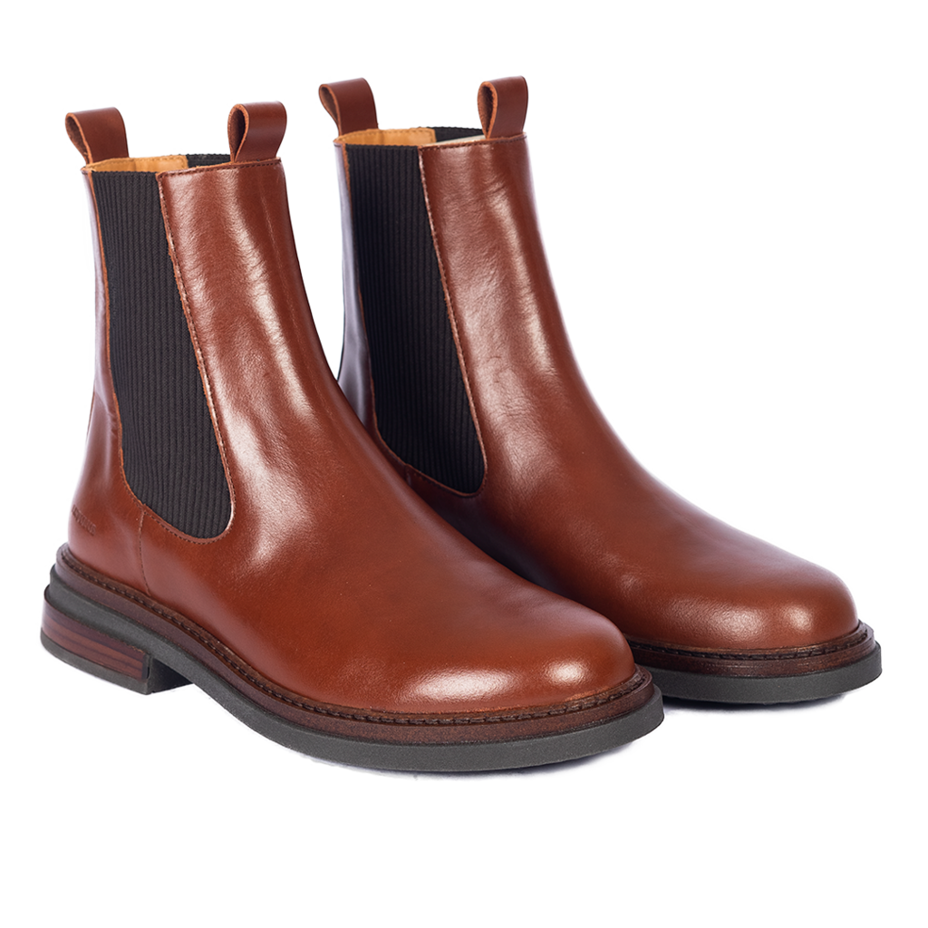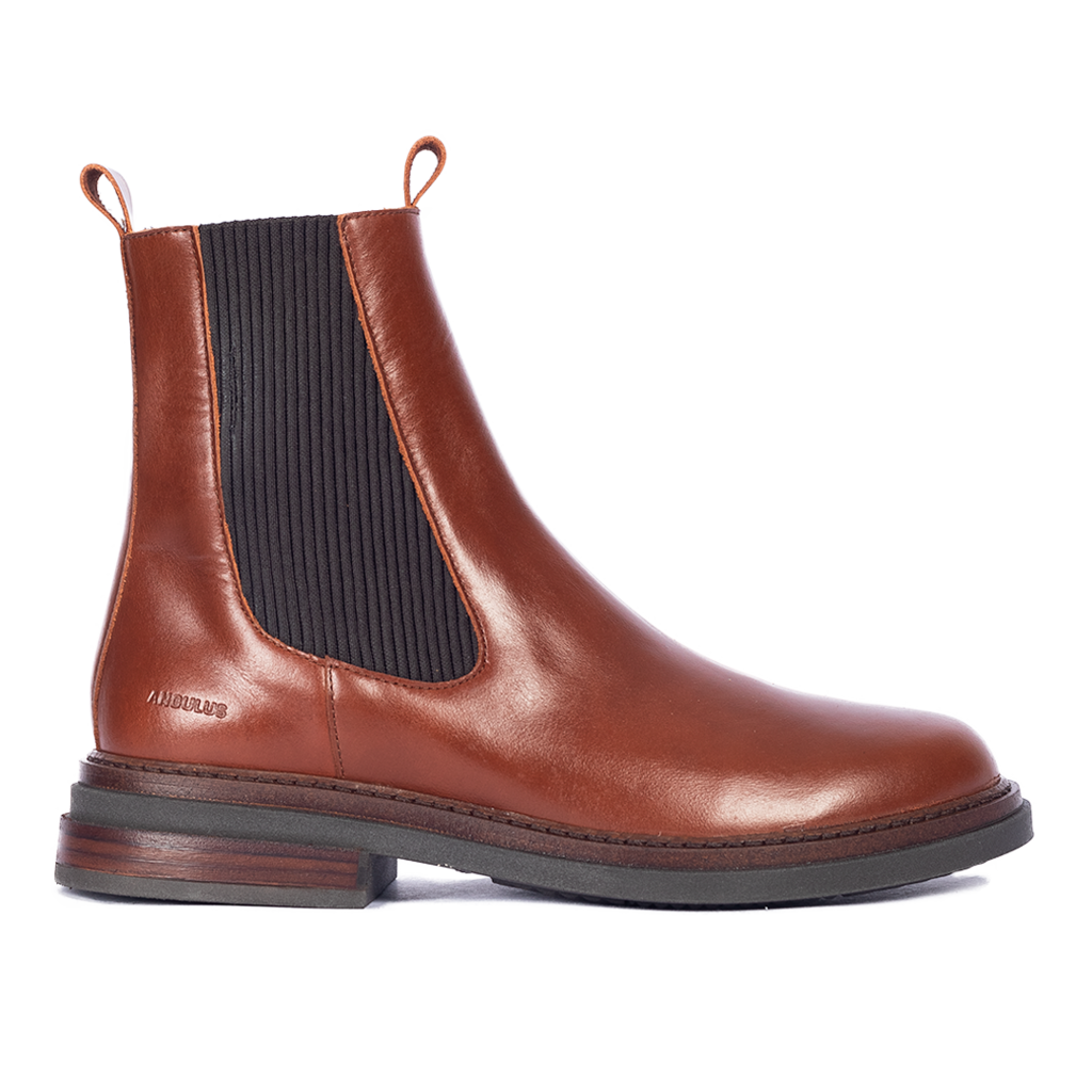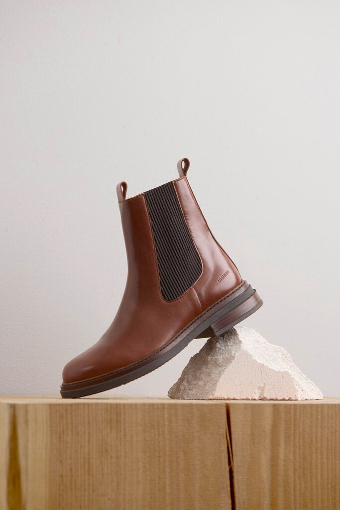 Enkel støvle i læder. Støvlen har en rundet snude, polstret indersål, kromfrit læderfoer, præget logo ved hælparti, tætsiddende ankelhøjt skaft med funktionel ribelastik og hælstropper samt en let og fleksibel gummisål med dekorativ stikningsrand. Udformet i naturligt og åndbart skind.