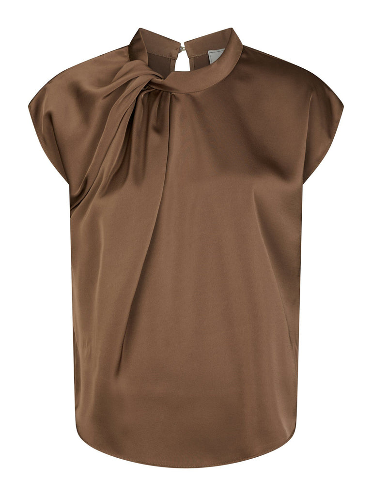 Feminin bluse med smuk knude detalje ved halsen. Blusen er i en lækkersatinkvalitet der falder smukt. Pasformen er løs, men feminin ogblusen kan nemt dresses op og ned tilat passe til både kontoret og fest.