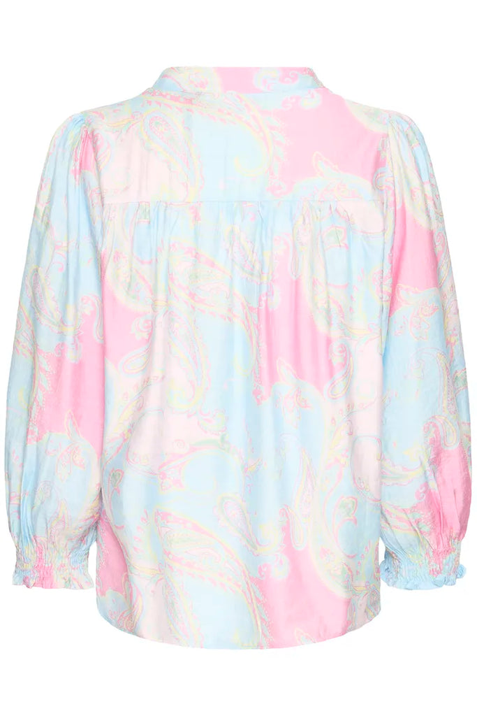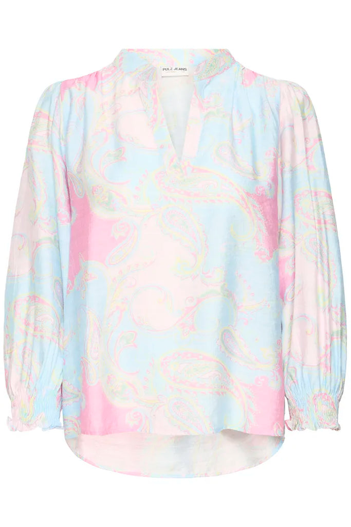 Smuk skjorte bluse fra Pulz i en smukt print i pink og blå nuancer.
