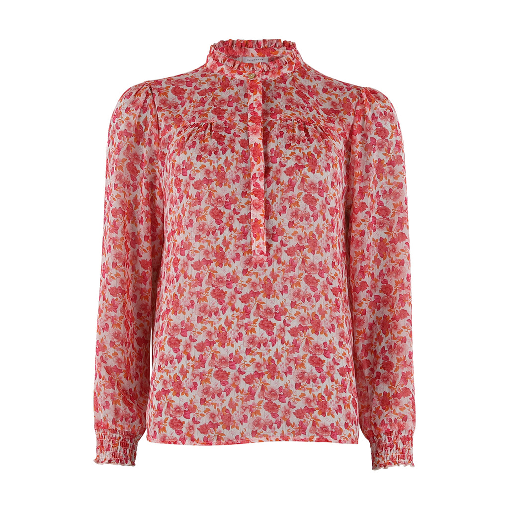Smuk skjorte bluse fra Continue. Den er med rund hals, hvor kraven går lidt op og har skjult stolpelukning ned front. Stoffet er i et stribede transparent look med guld syninger i, hvilket giver et flot liv til blusen.