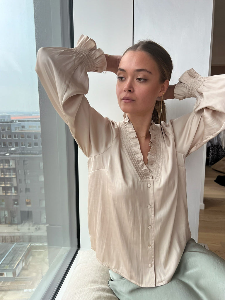 Feminin skjortebluse med knapper foran og smock detaljer. Blusen kommer i en lækker kvalitet der draperer smukt.