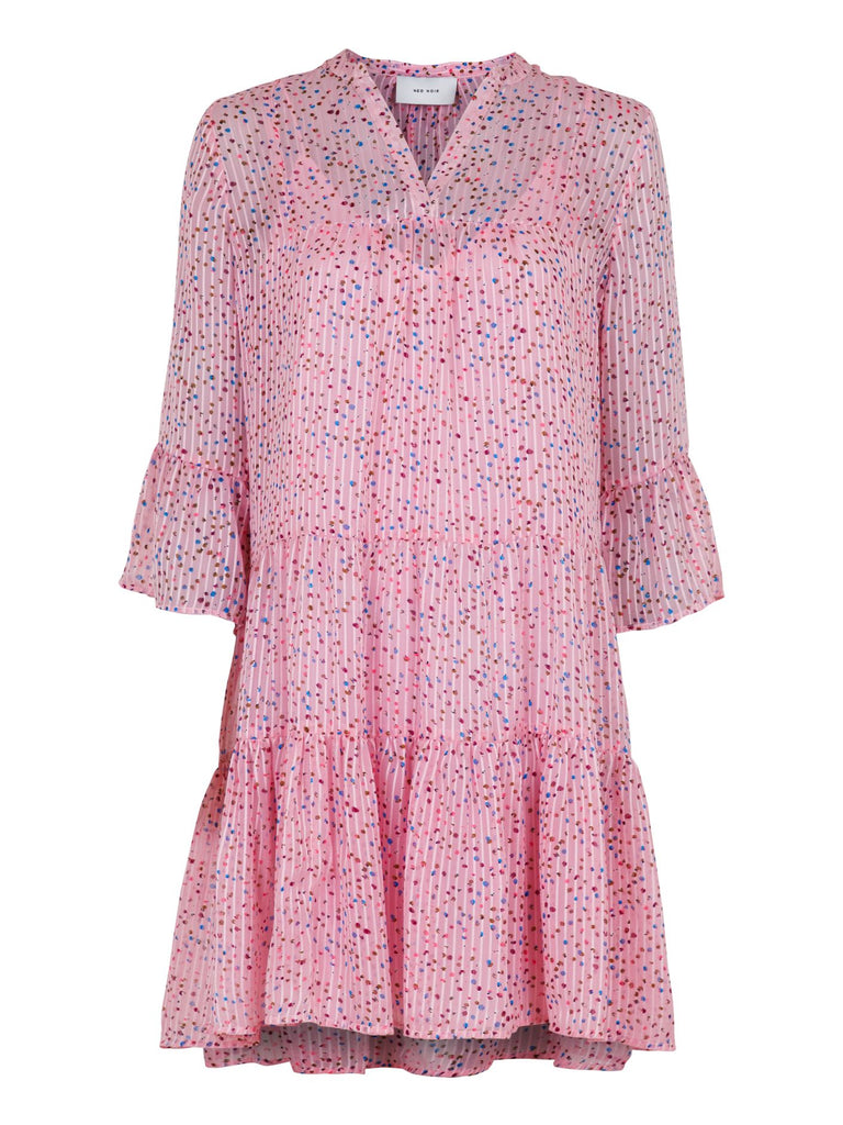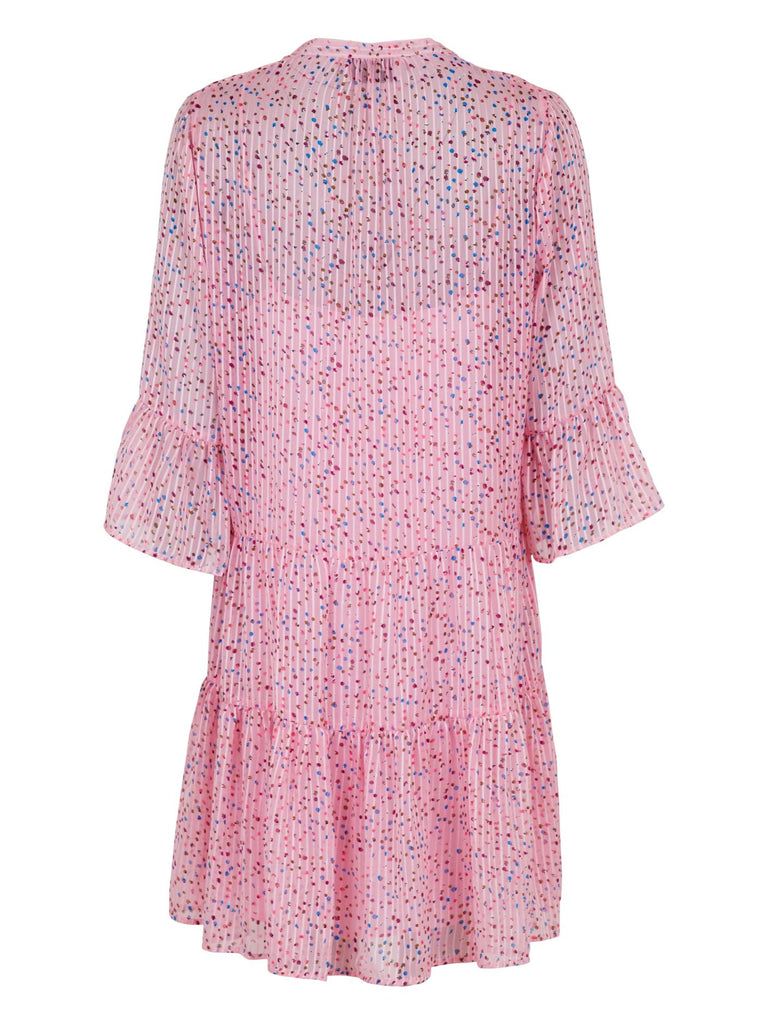 Den er i et flot pink stof med farvede prikker på. Kjolen er med V-udskæring og 3/4 lange ærmer, der er afsluttede med en smule trompet ærme. Endvidere medfølger der en lyserød underkjole og den har flotte feminine skæringer - som giver kjolen et flot og feminint udtryk.