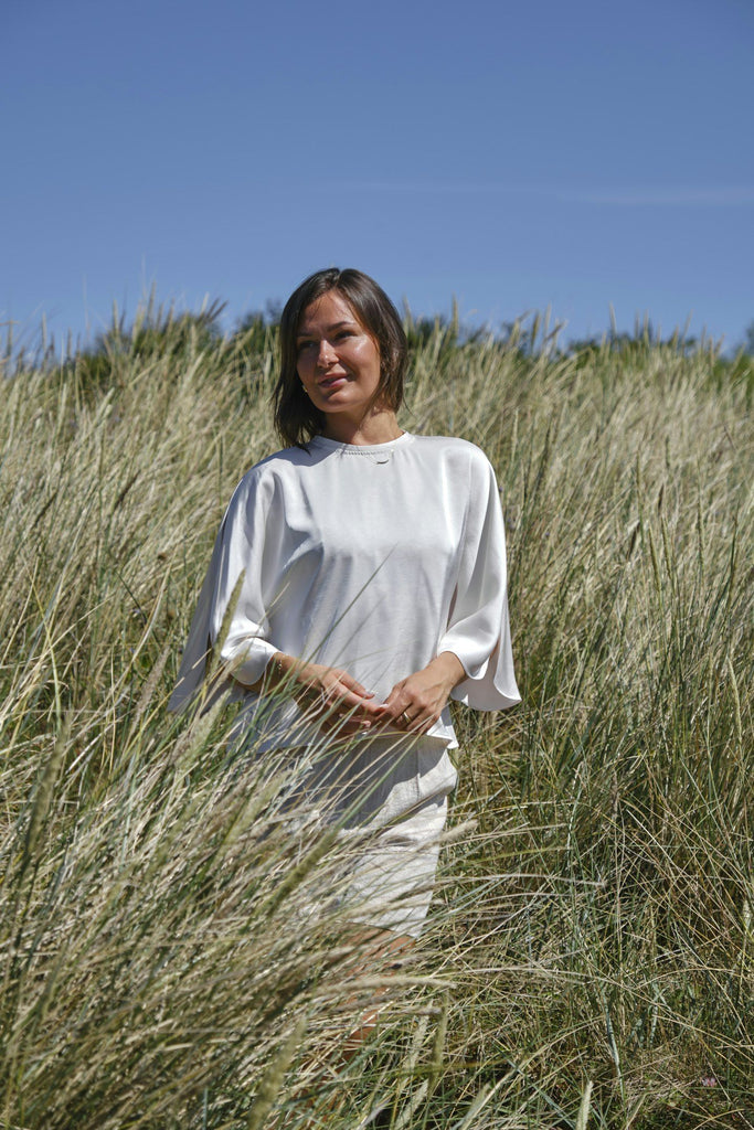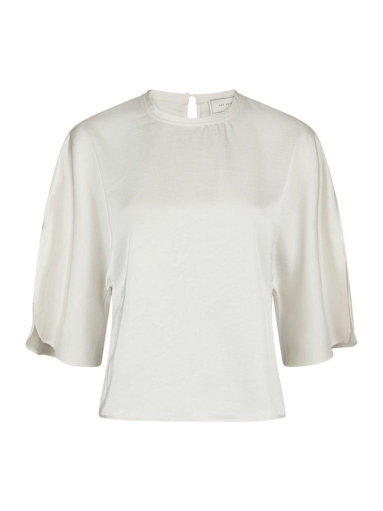 Feminine bluse med flatterende løse ærmer med en høj slids. Blusen kommer i en satin kvalitet. Modellen er 176 cm høj og bærer størrelse 36.