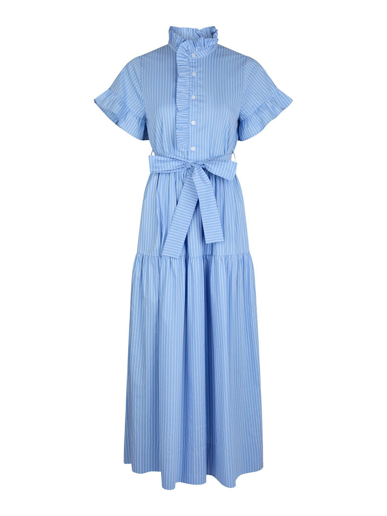 Kjole i stribet bomuldspoplin med korte ærmer og lommer i siden. Kjolen har flæsedetaljer ved ærmerne, samt krave og knapper ned foran. Der er bindebånd i livet, samt smock i taljen bagpå. Modellen er 176 cm og bærer en størrelse 36.