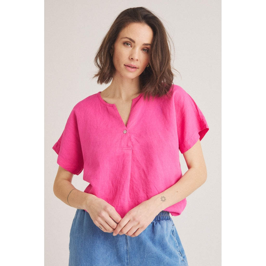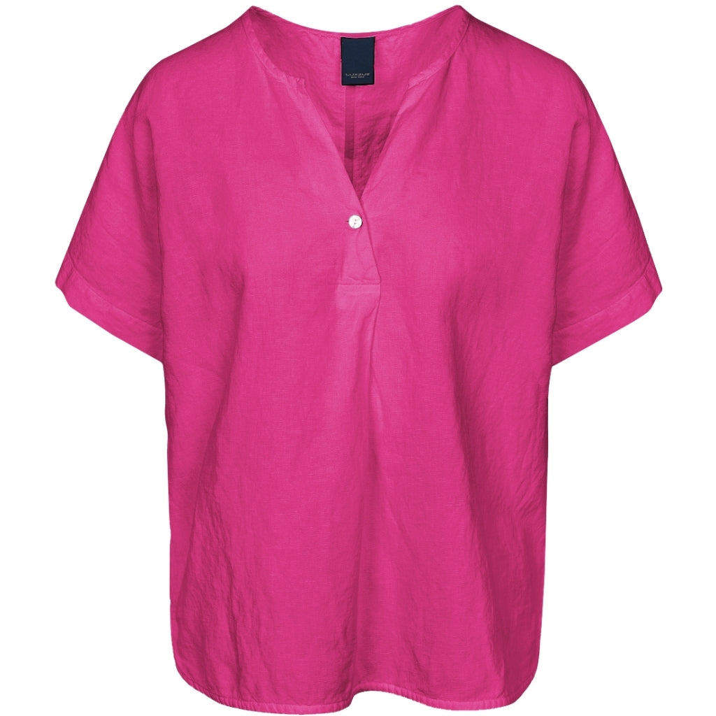 Super anvendelig kortærmet bluse med hør fra LUXZUZ ONE TWO. Blusen har rundhals, der åbner op i et V, samt en lille knap og et læg.
