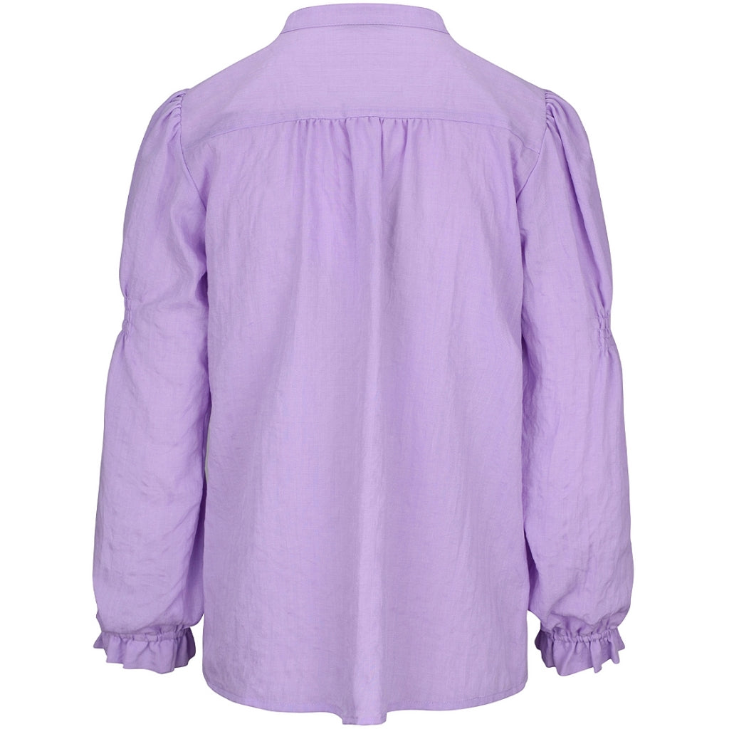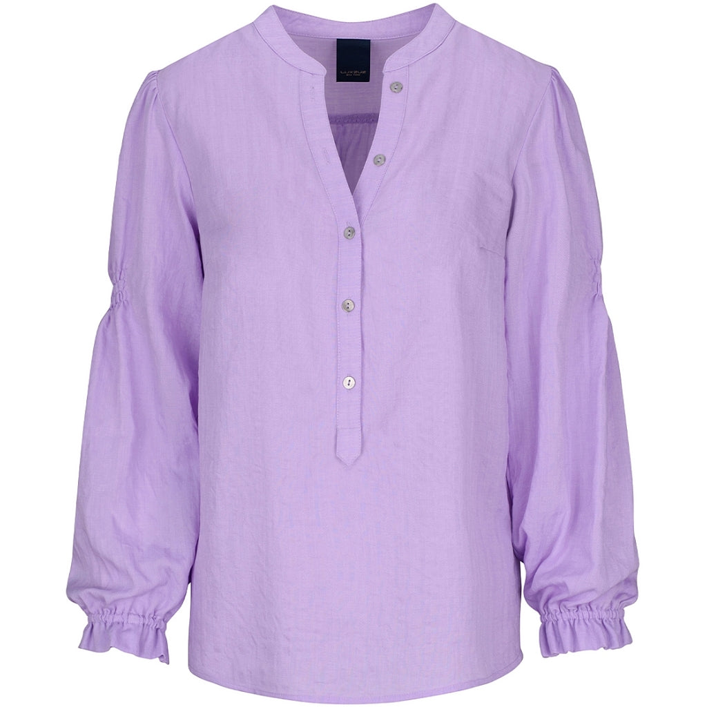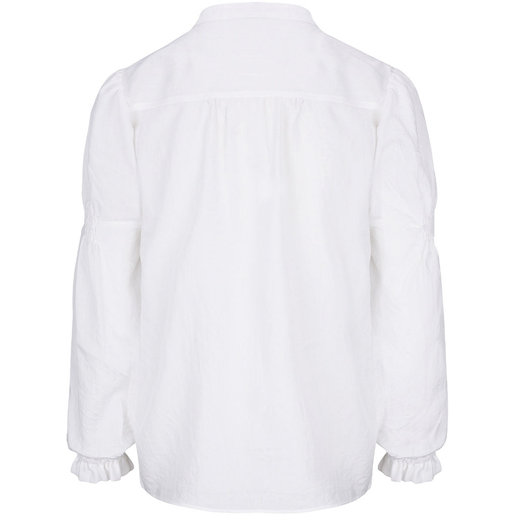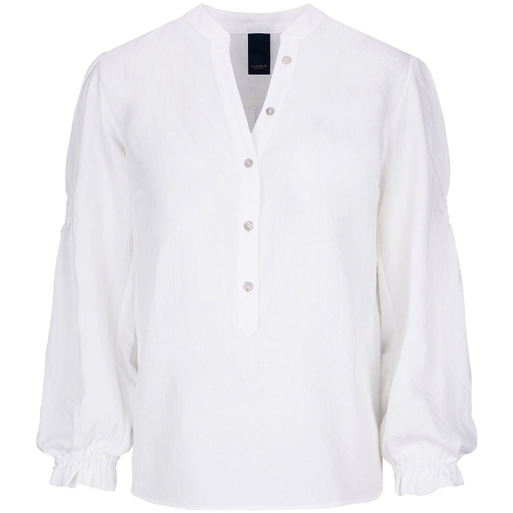 Afslappet skjortebluse fra LUXZUZ One Two, med rund hals, der åbner op i et V og en flot stolpelukning. På ærmerne er en fed smock detalje, som er med til at give lidt pufeffekt, ærmerne afsluttes en med smal elastik og flæse. Ryggen har en overskæring med læg.