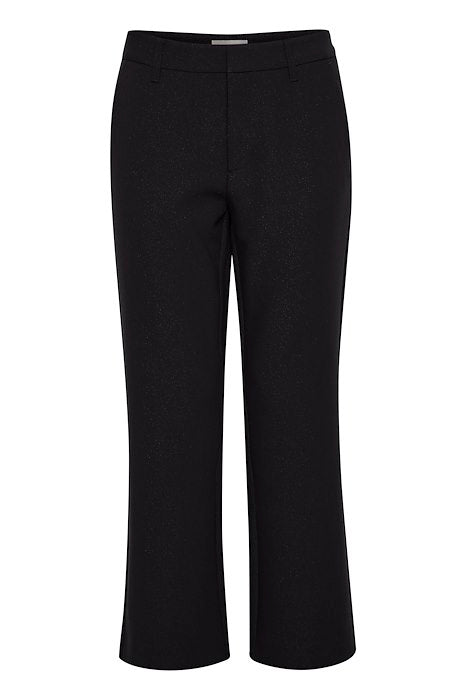 Klassisk sort buks med sølv glimmer i stoffet. Buksen har høj talje med fast linning, skrå lommer og bæltestropper. Buksen har lidt vidde i benene og en fantastisk god pasform.