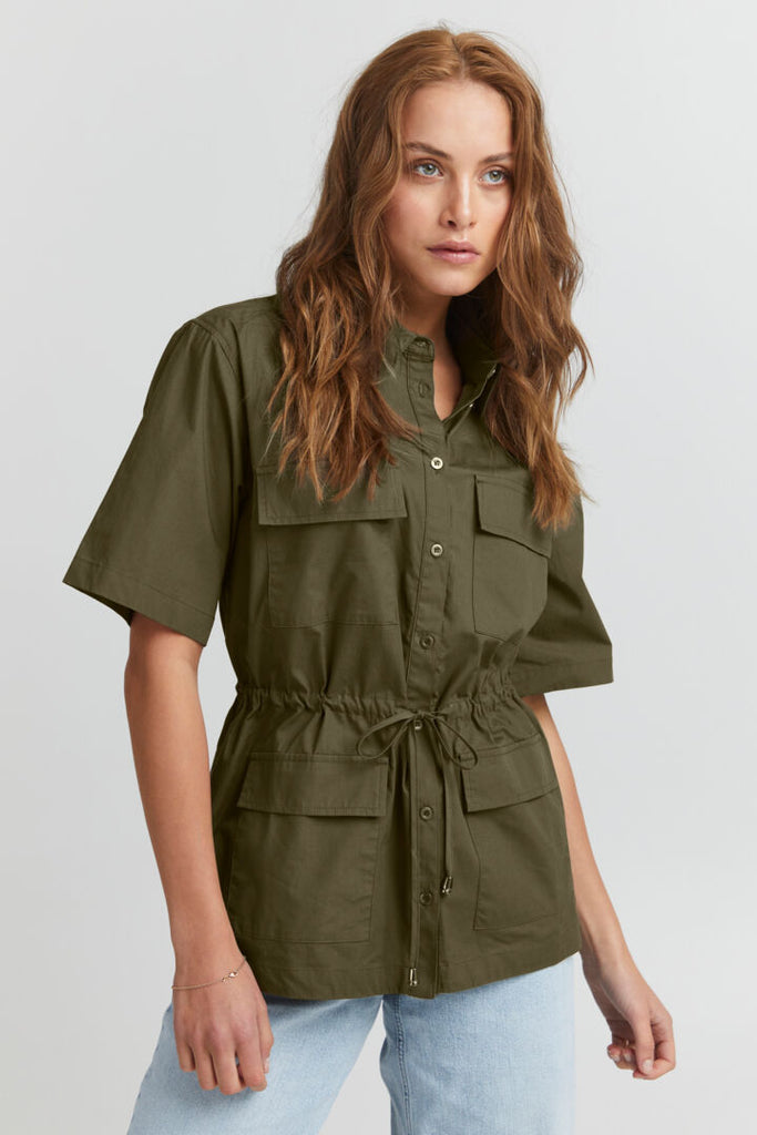 Cool skjorte fra PULZ i en mørk army farve. Kan også bruges som en lille jakke. Fremstillet i 100% bomuld.