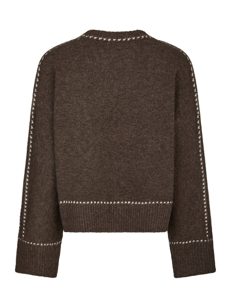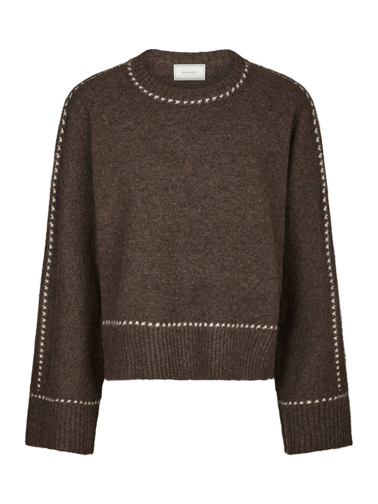 Cool striktrøje med lange løse ærmer. Trøjen har en løs pasform og synlige stikninger ved halsudskæringen, ærmekanterne og trøjens bund. Modellen er 176 cm og bærer en størrelse 36.