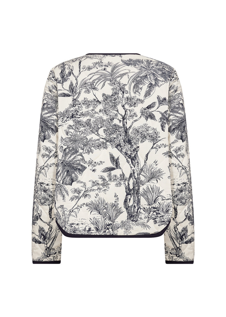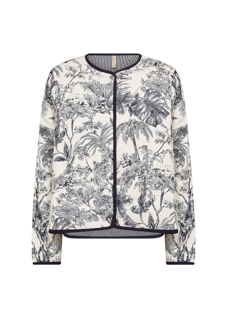 Smuk vatteret jakke fra Soya i et flot navy print. Jakken er med tryk knapper og med et cool stribet foer.