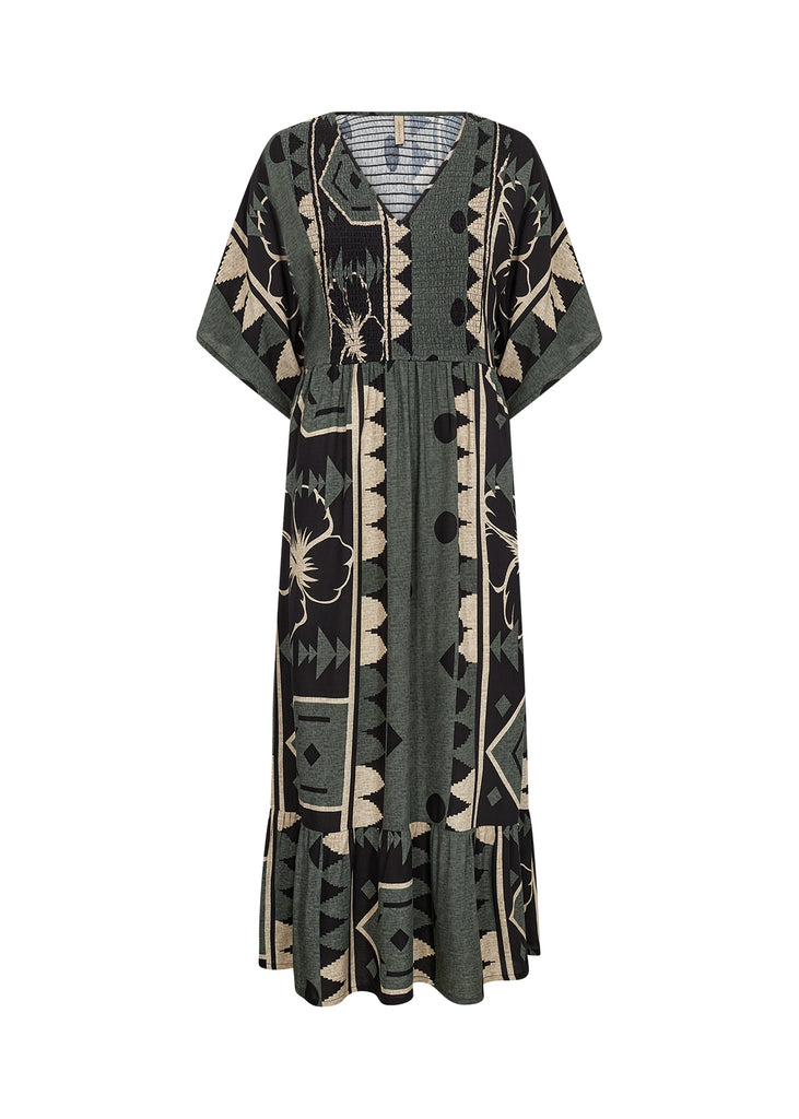 SC-ROSALIE 3 er en kjole, der er fremstillet af 100% LENZING™ ECOVERO™-viskose. Kjolen har et mellemlangt snit, V-udskæring og et mønstret design med rynket talje. Den kan dresses op med høje hæle eller bæres afslappet med flade sko til forskellige lejligheder.