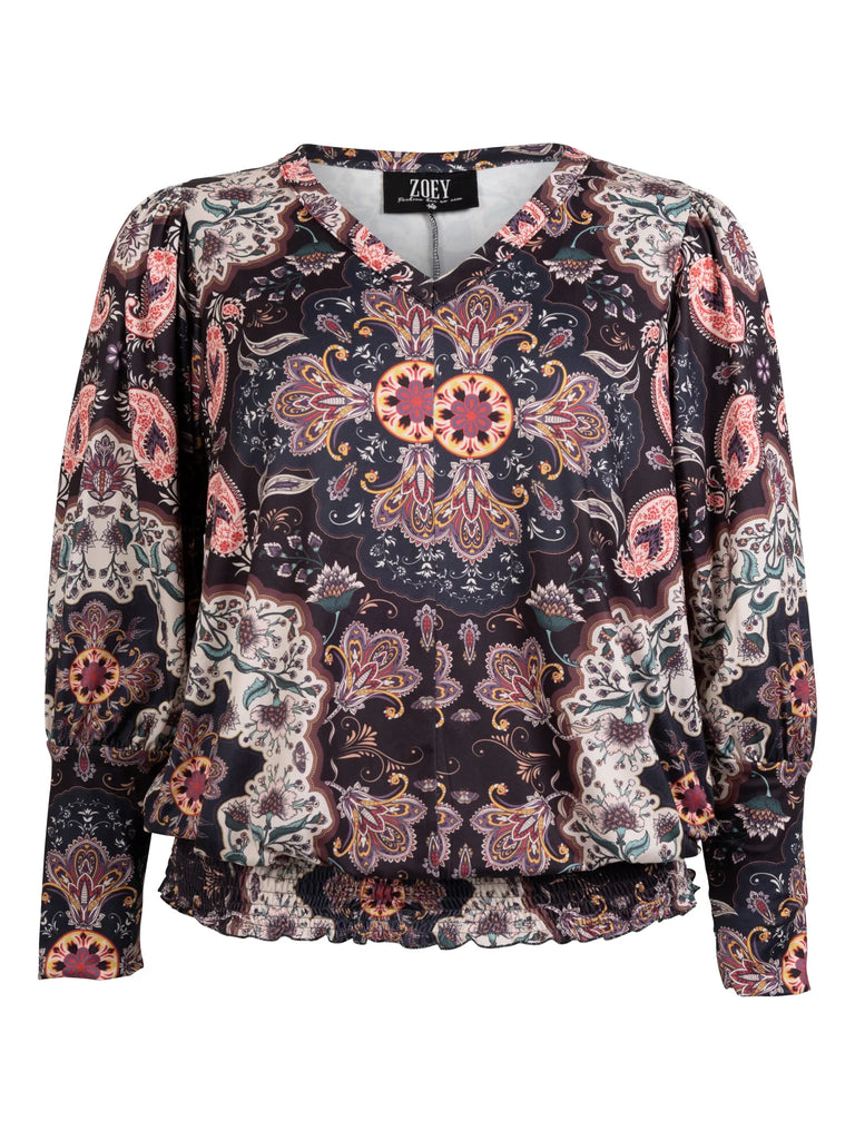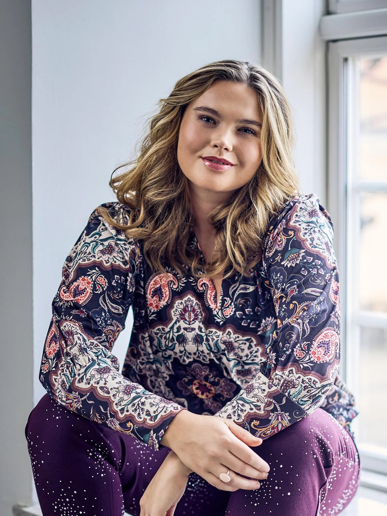 Denne fine bluse er designet i et elegant efterårsprint på et blødt og behageligt materiale, som føles let mod huden og giver en flatterende pasform. Med sin klassiske v-halsudskæring og volume detaljer ved de lange ærmer, får du en tidløs stil, der både er komfortabel og moderne.